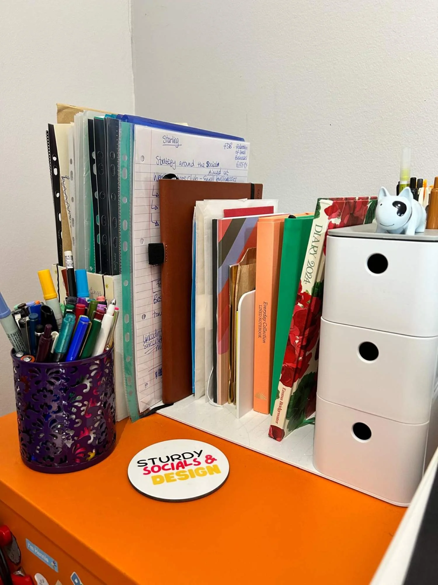 Generally I have at least one notebook I use daily to make notes when talking to clients and to also write my “to-do” lists in. I used to have one notebook per client, but I changed that as it got a bit complicated at times and I didn’t want to turn up to a meeting with the wrong one! I use sticky tabs at the side to highlight which client the notes are for instead.